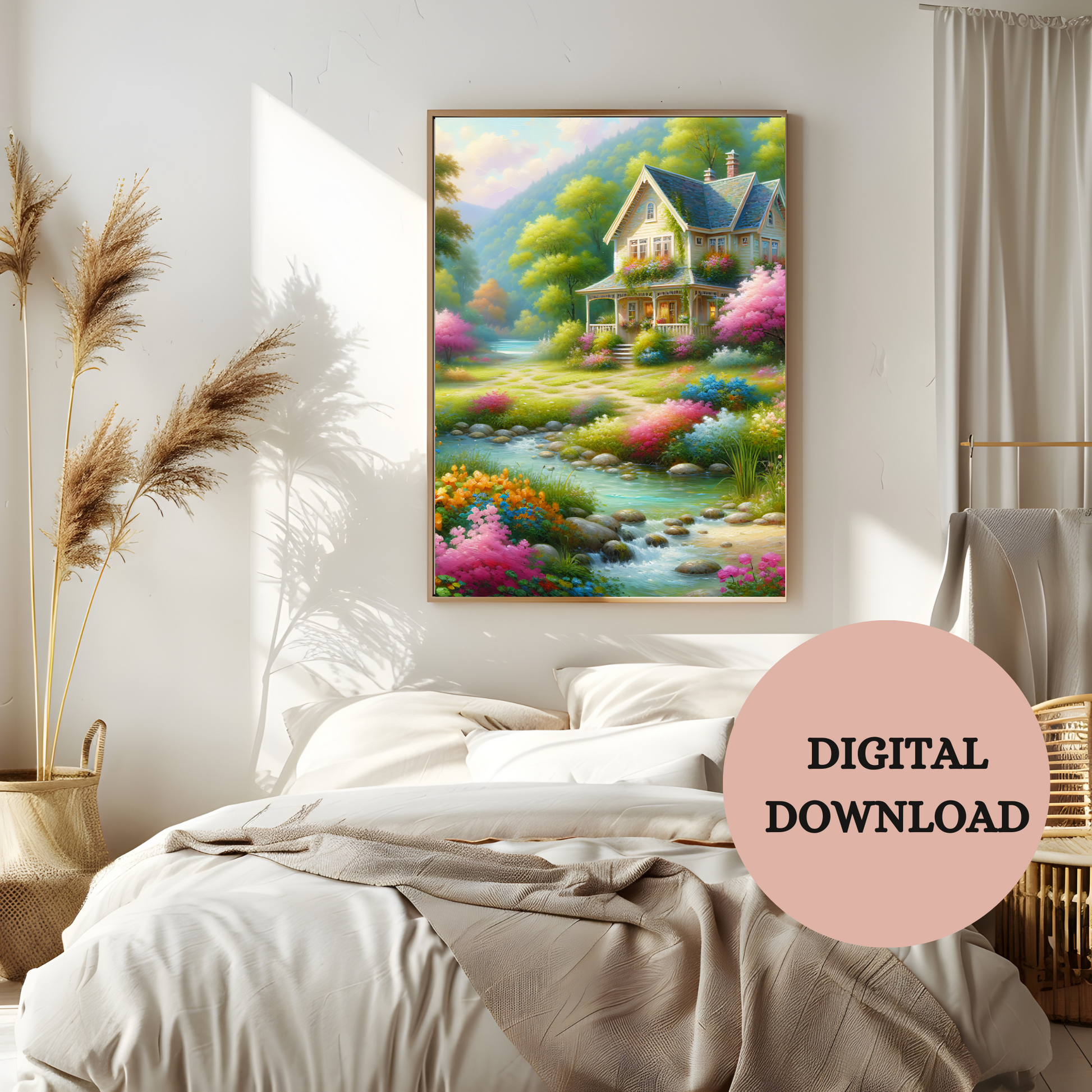 Step into a world of calm and wonder with this dreamy countryside cottage printable wall art. Nestled beside a gentle river and surrounded by wildflowers and glowing gardens, this enchanting scene captures the peaceful essence of a fairytale retreat.