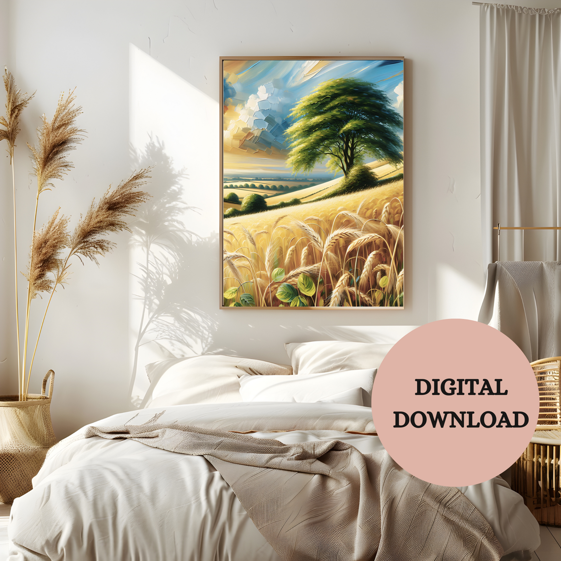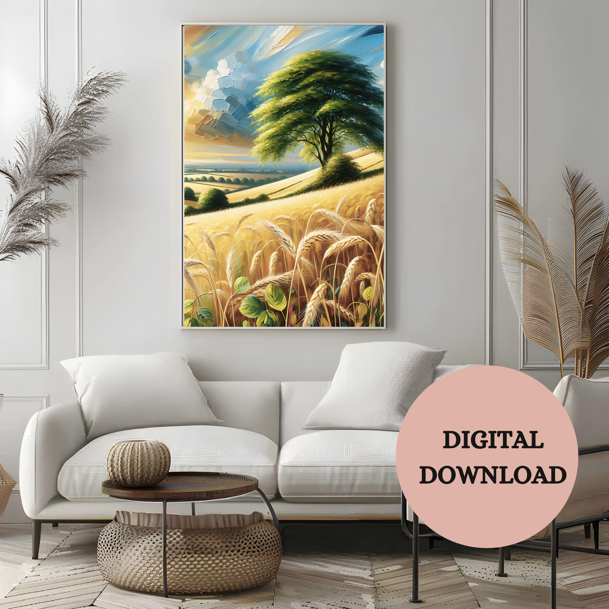 Immerse yourself in the golden glow of this impressionist countryside printable wall art. Rolling hills, a lone tree, and fields of wheat shimmer under the warmth of the sun, painted in rich textures and expressive brushstrokes that capture the poetry of rural life.