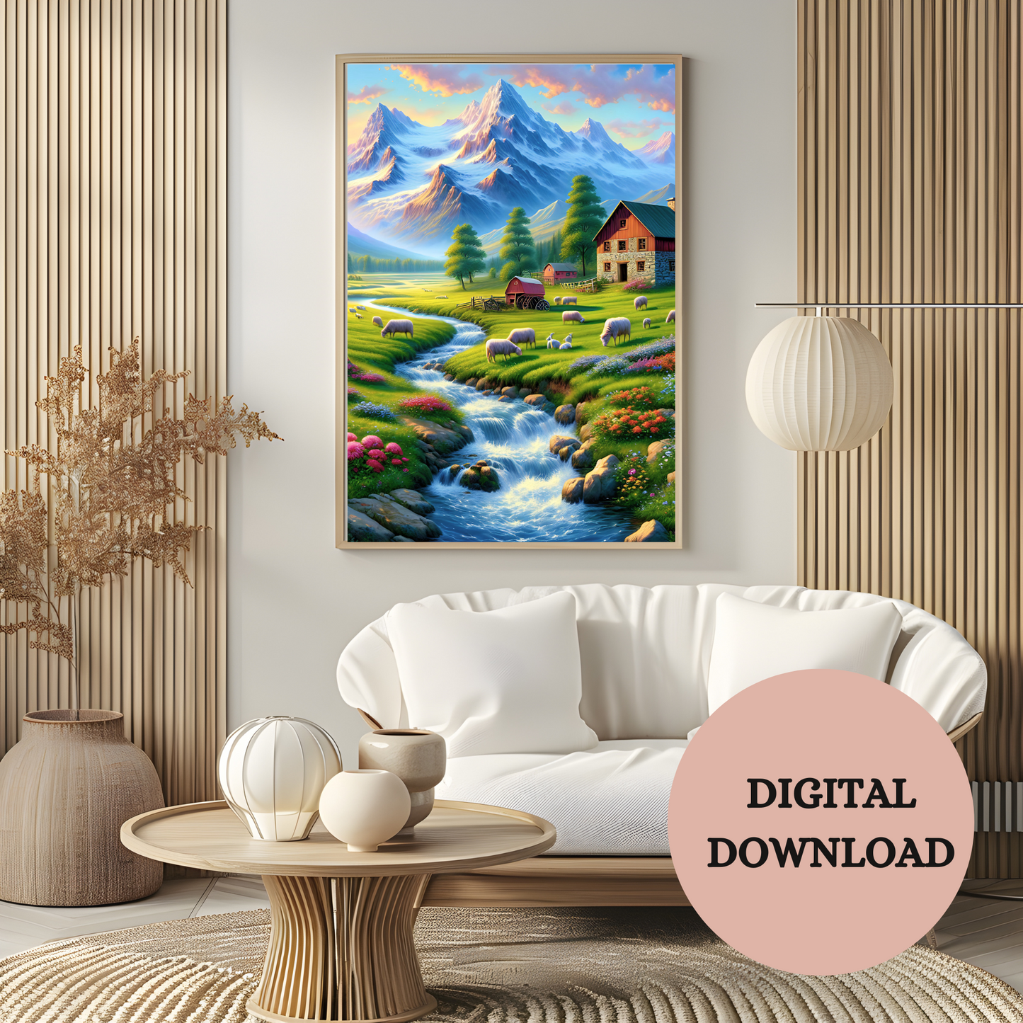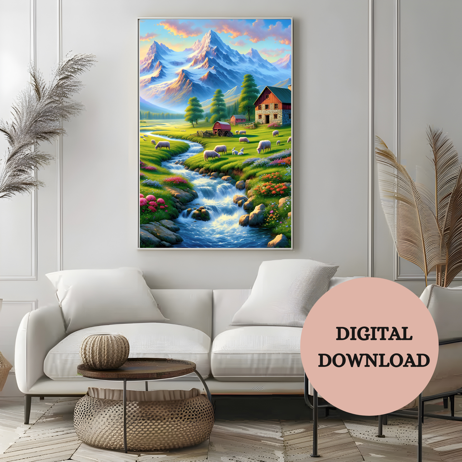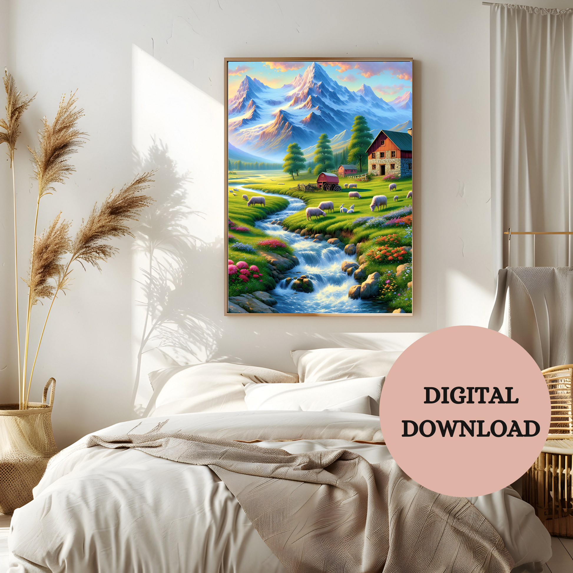 Escape to the countryside with this tranquil farm landscape printable wall art. A cozy farmhouse rests between lush green pastures and snow-capped peaks, as a crystal stream winds gently through fields dotted with grazing sheep. Warm sunlight and mountain air blend together to create a scene full of peace, nostalgia, and natural charm.