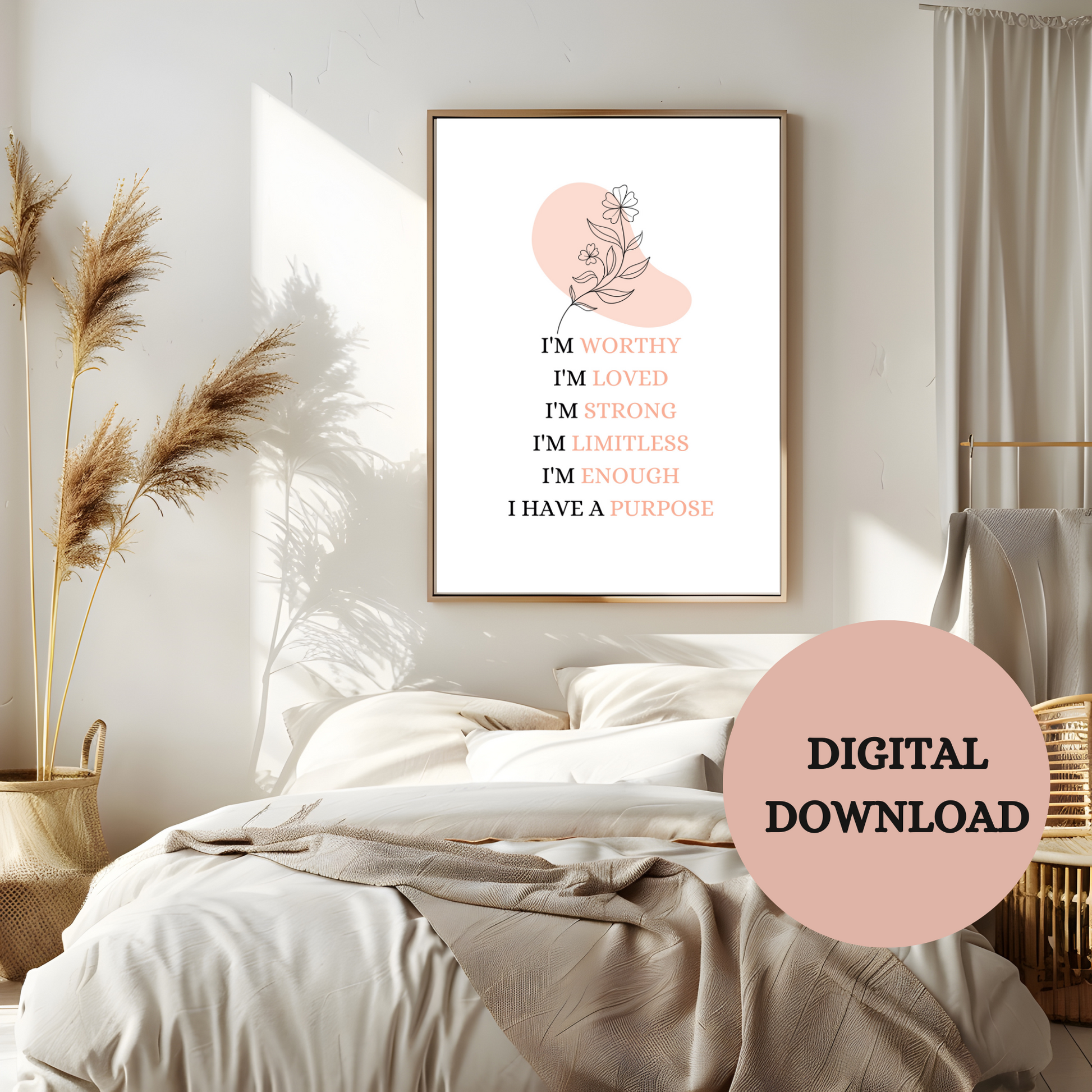 Begin each day with positivity and purpose through this motivational printable wall art. Featuring elegant typography and a minimalist floral design, this affirmation art print inspires confidence, gratitude, and self-love — a gentle reminder to stay grounded and empowered.