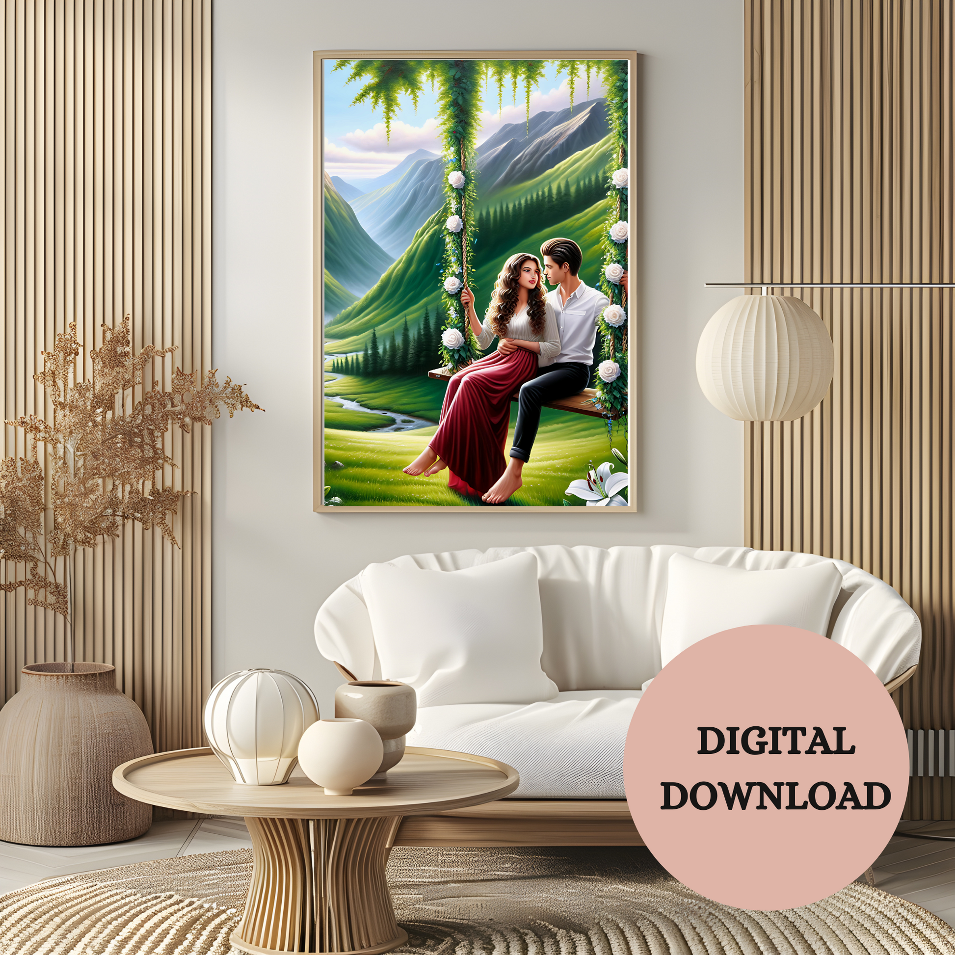 Celebrate love surrounded by nature’s beauty with this romantic swing printable wall art. A couple sways gently on a flower-wrapped swing overlooking misty mountains, flowing meadows, and a serene river below. Bathed in soft golden light, this piece captures the essence of peace, tenderness, and timeless connection.