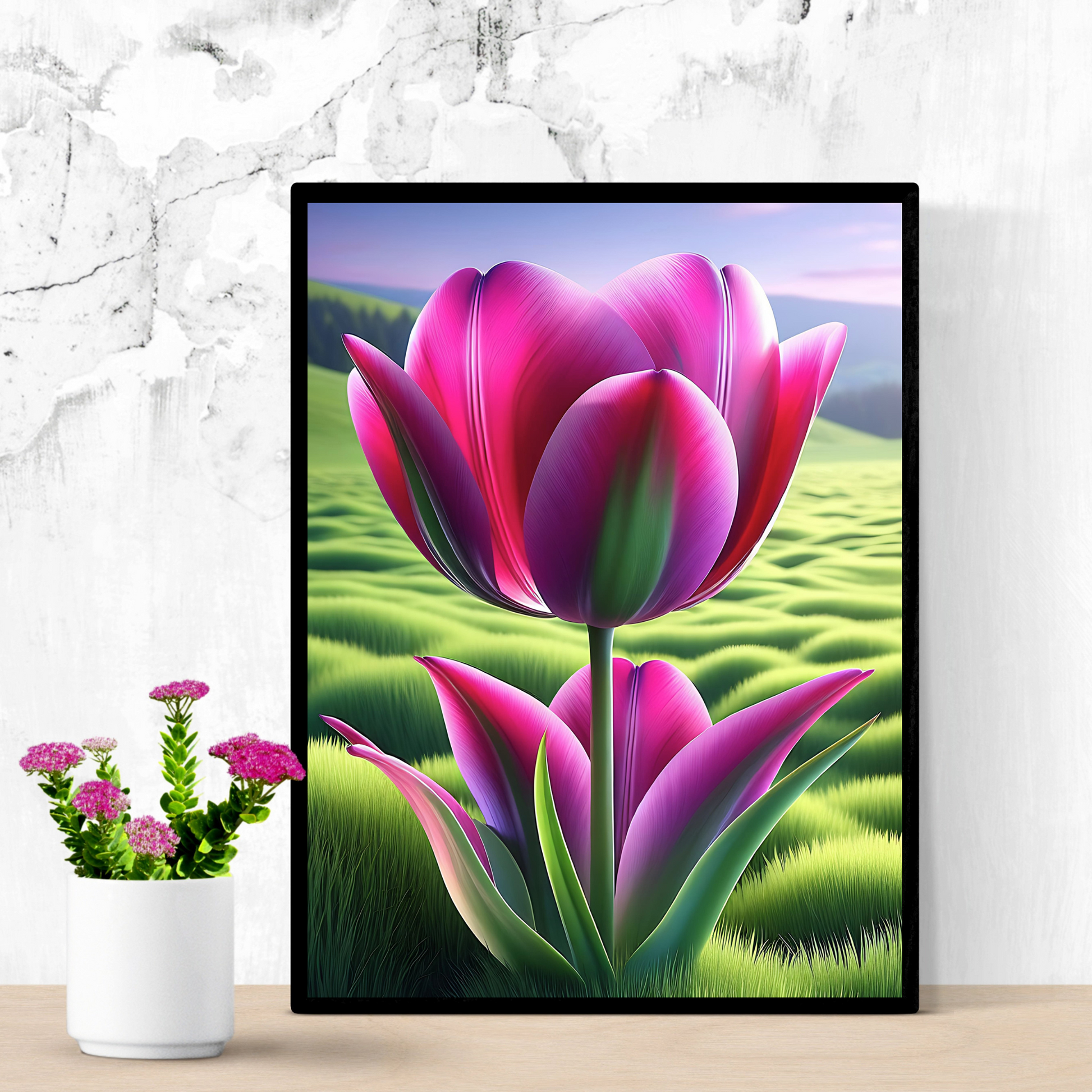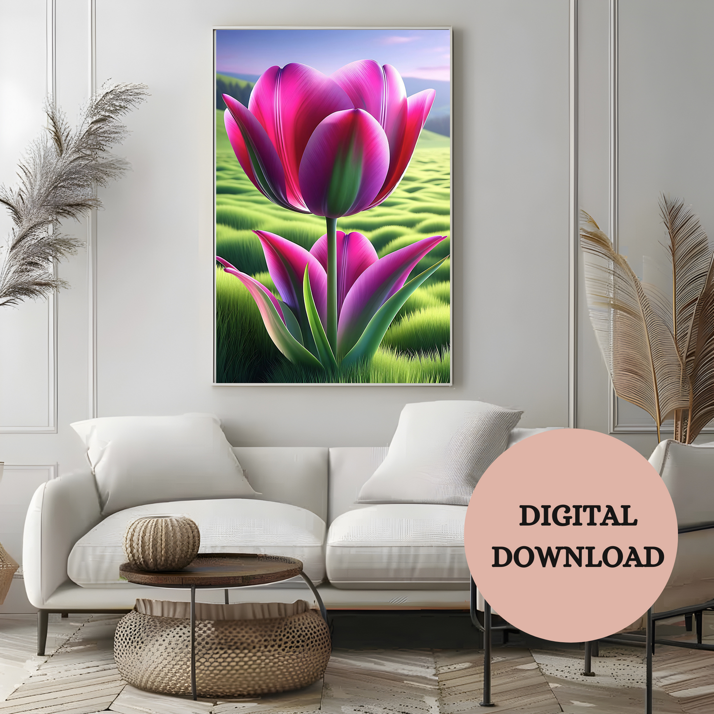Bring bold elegance and modern botanical beauty into your home with this vibrant tulip printable wall art. A vivid pink tulip rises gracefully over rolling green hills, bathed in radiant light and surrounded by soft, dreamlike tones. The result — a striking floral centerpiece that blends realism with surreal charm.